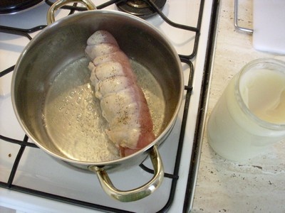 Plátok morčacích prs rozklepeme,osolíme,okoreníme a potrieme horčicou.Uložíme naňho osolenú a okorenenú panenku ktorú sme naplnili klobásovou zmesou.
